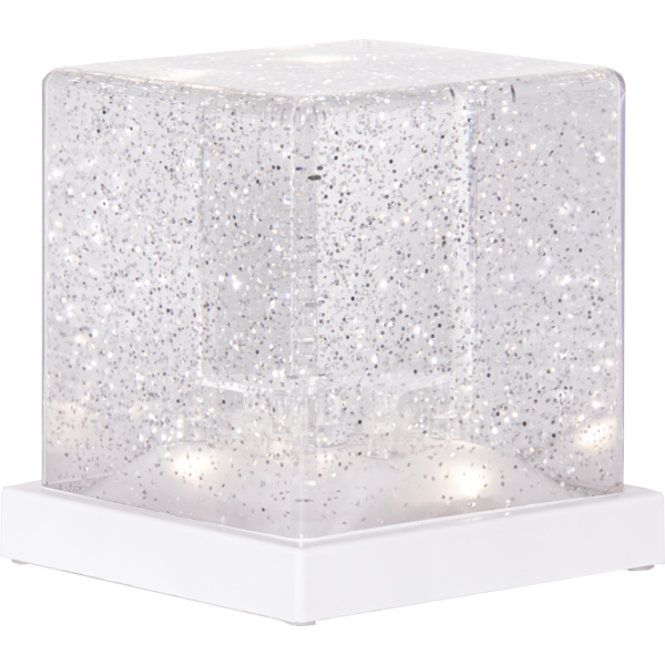 Batteridriven bordsdekoration med glittrande vätska. Inbyggd fläkt med motor ger en vacker dekoration med effekten av att det snöar inuti. Den inbyggda timern gör det lätt att ställa in när produkten ska lysa. Dekorera till jul och advent för den perfekta julkänslan. Placera iskuben i en hylla eller på ett bord och tänk på att inte placera den i direkt solljus.