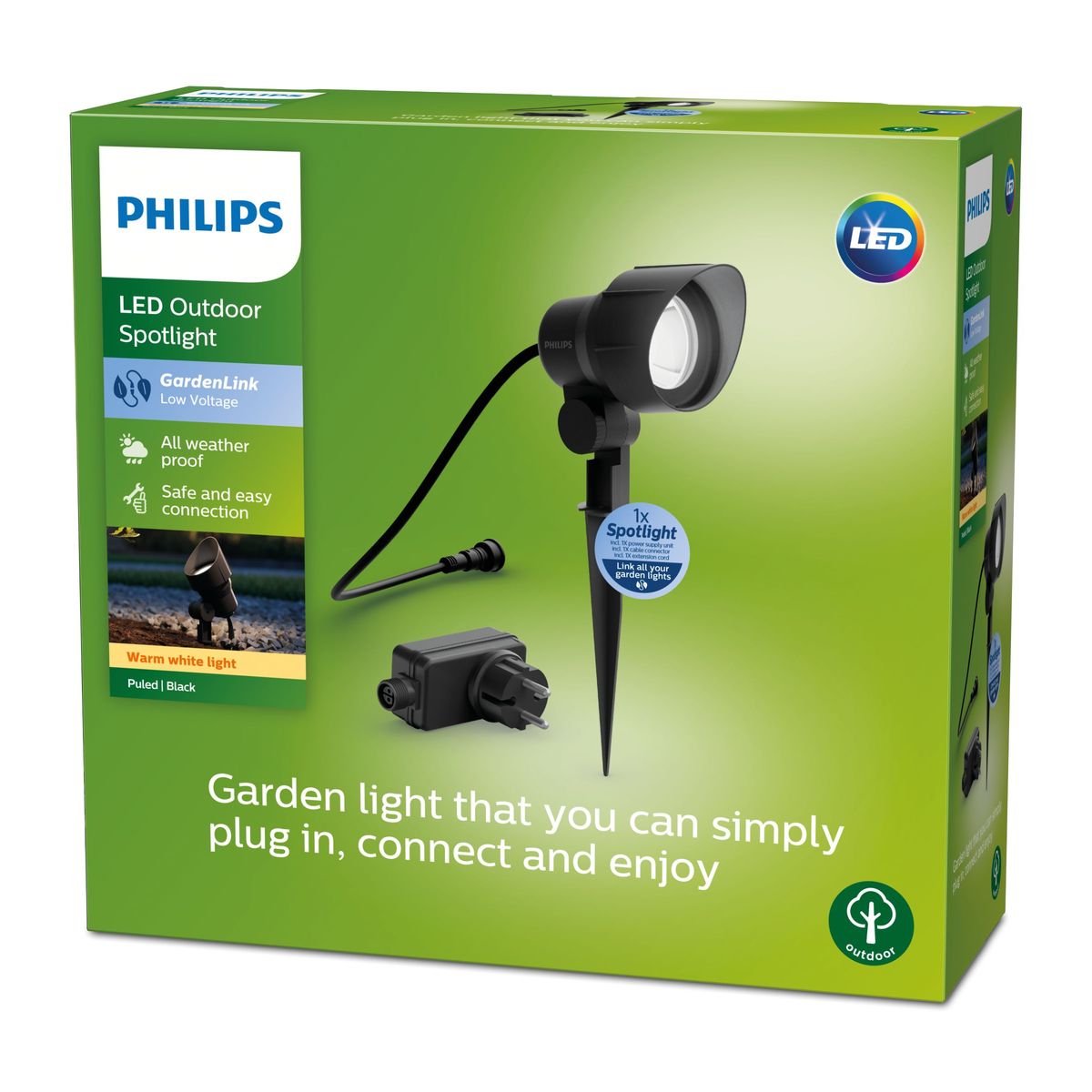 La famiglia di apparecchi di illuminazione a bassa tensione Philips GardenLink offre una gamma di apparecchi di illuminazione per esterni che puoi installare facilmente e in tutta sicurezza. Puoi collegare più luci a un'unica fonte di alimentazione e collegarla a una presa standard, per poi aggiungere facilmente altre luci o spostarle quando vuoi. Il cablaggio è semplice e grazie alla bassa tensione non vi è alcun rischio di lesioni per te, i tuoi bambini o i tuoi animali domestici.